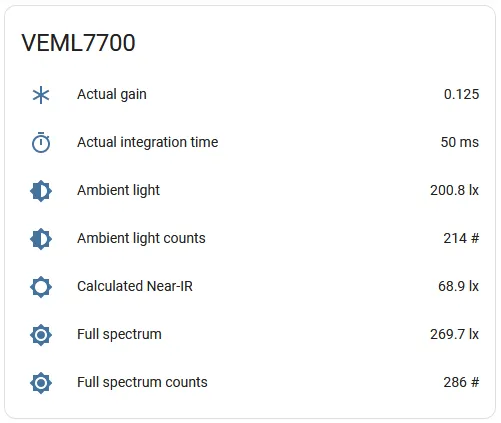 • full_spectrum (Optional): Illuminance for the full spectrum sensor (WHITE channel), lx.