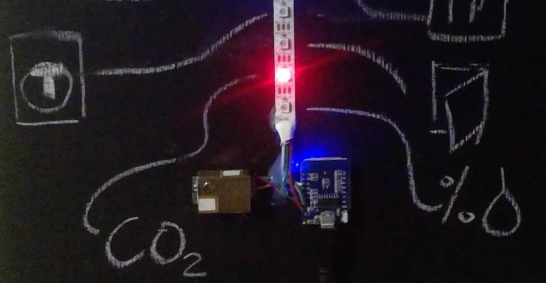 The automation to show the CO2 warning light (e.g. red if CO2 > 1000 ppm) is done in Home Assistant, but could also be implemented using ESPHome Automations.